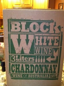 Choice of libation: Trader Joe's Block White Wine chardonnay.  It's a good chardonnay if you don't like chardonnay, which I don't.  More citrus and less butter than I would expect.  Also, it was a little over $10 for 3 liters.  Wahoo!